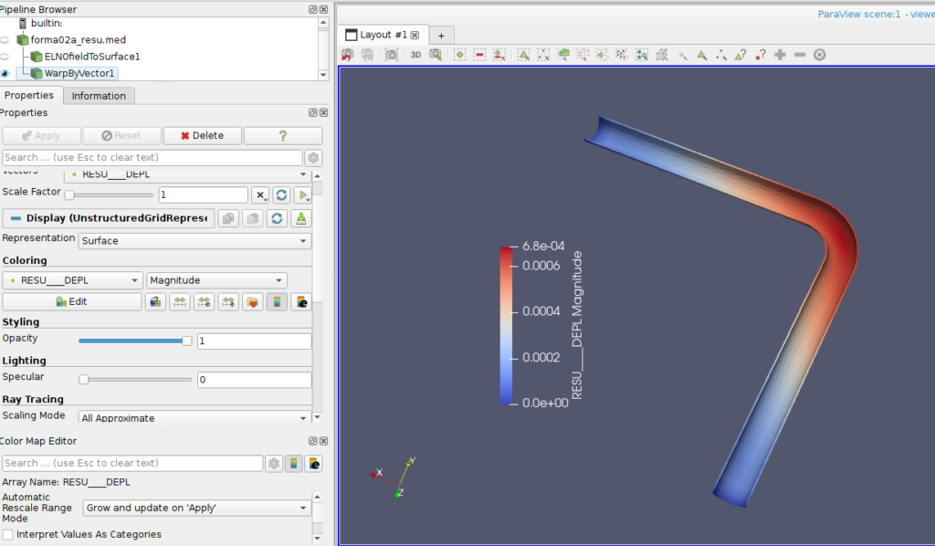 曲がっている部分の変形が大きいことがわかります。変位の絶対値はとても小さいです。