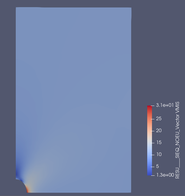 穴の横方向に応力が集中しているのがわかります。材力の教科書のとおりの結果ですね。